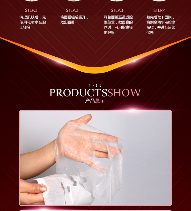用法:每天1次,清洁后取出面膜,取中间透明的真丝膜直接敷於面部,保持20-30分鐘至