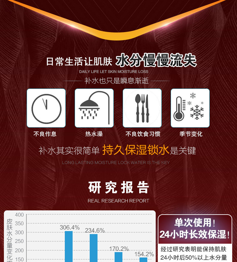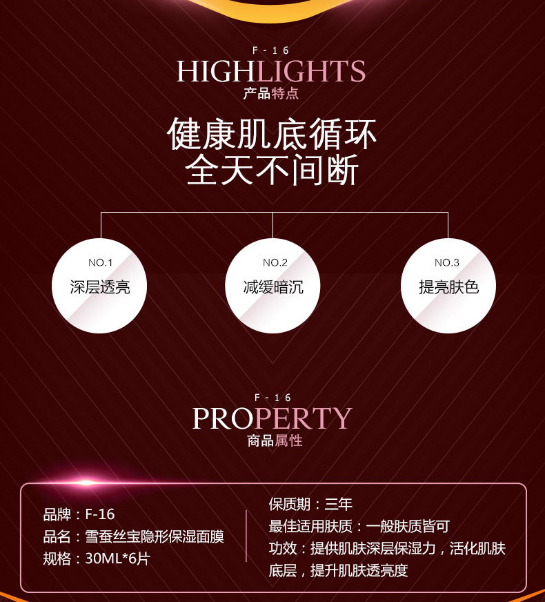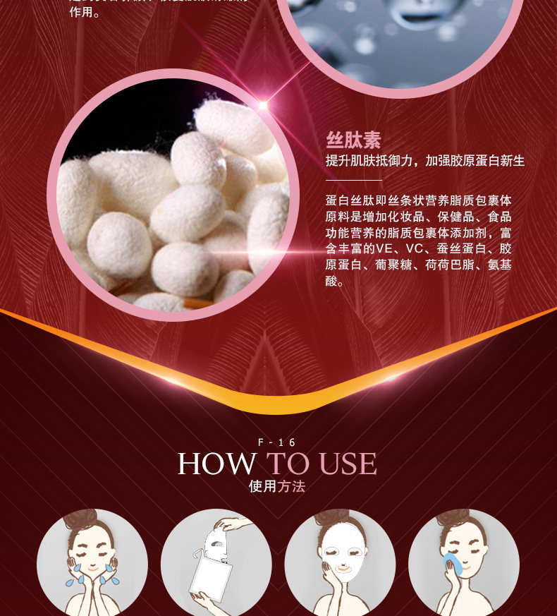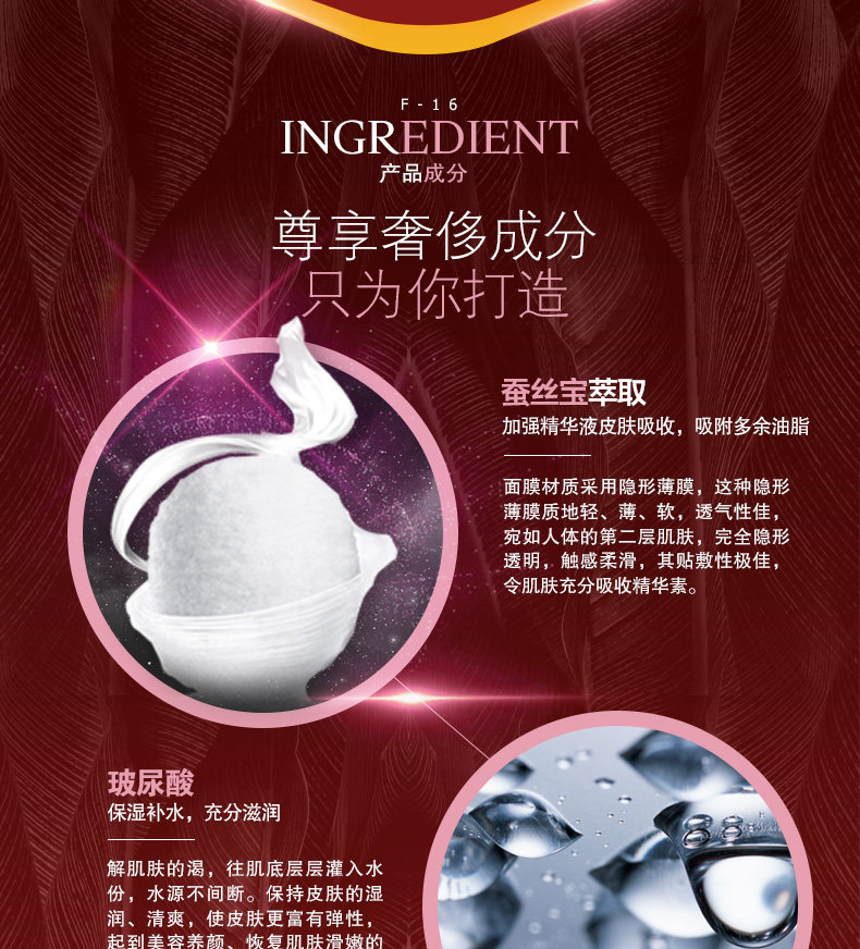 功效:採用日本顶级天宝雪蚕丝特殊织造;经特殊的5维立体仿生结构特殊处理,富含18种珍贵的天然复合氨基酸小分子精华,长达48小时的迴圈渗透滋养效果,可快速渗透至肌肤表里,令保养效果显着提升8倍,肌肤光彩照人。